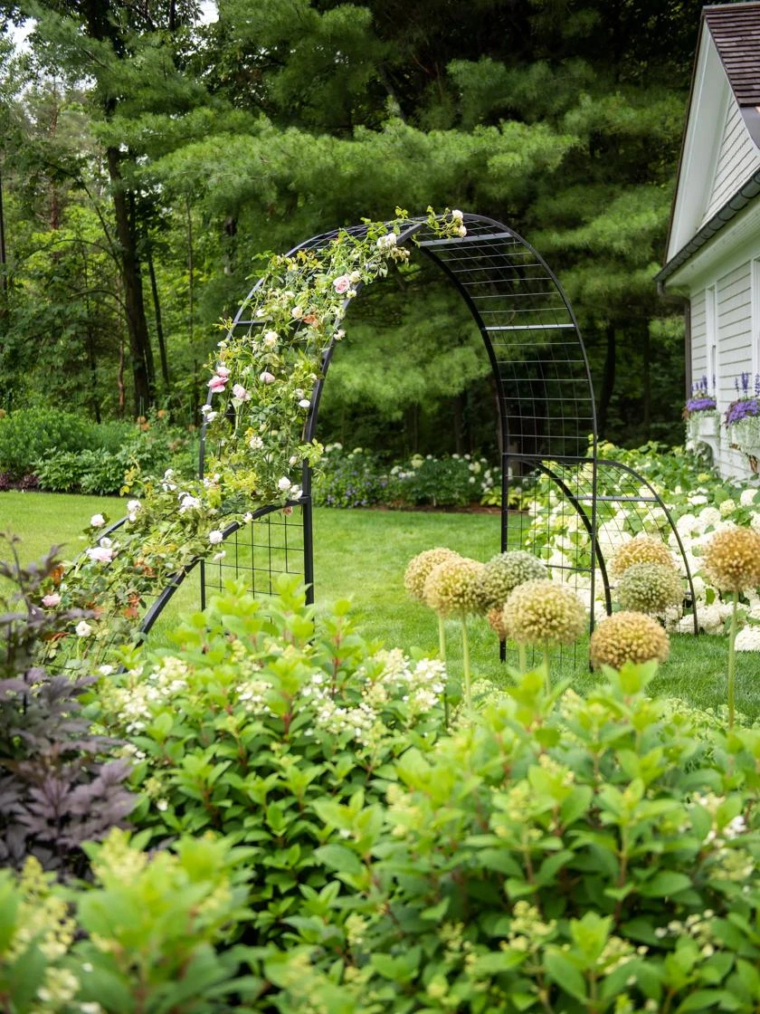 Create an (edible!) entrance like no other. Try cukes on the side wings, greens underneath, beans on one side of the tall arch, and peas or squash on the other. Or go with something sweet-smelling and dramatic like climbing roses, clematis, or morning glories. The possibilities are endless! The grid spacing is perfect for most fruiting vine crops and the sturdy steel construction won’t bend or buckle under an abundance of fruit.